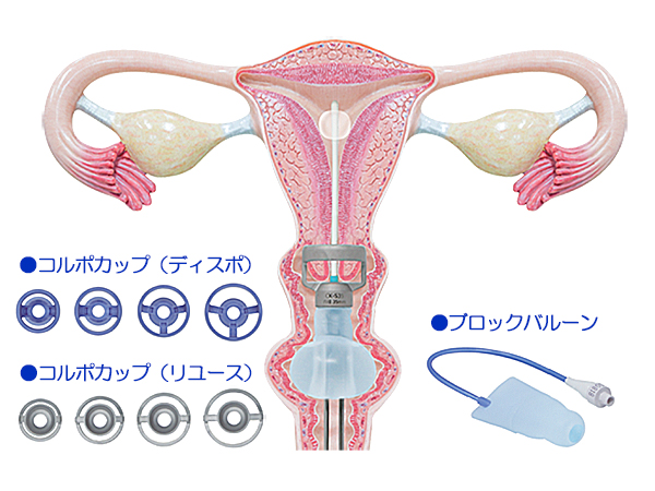 LH・LAVHなど腹腔鏡下で子宮を全摘する場合、基本セットにコルポカップ、ブロックバルーンを装着して使用します。